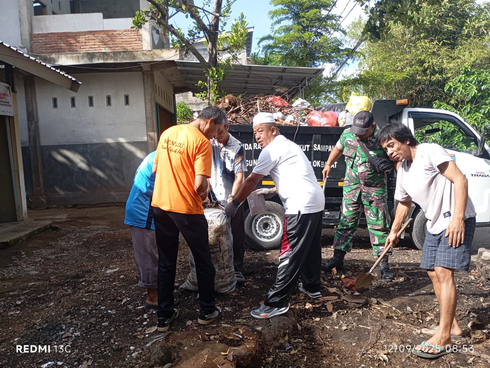 Lombok Barat, NTB – Bintara Pembina Desa (Babinsa) Dopang, Komando Rayon Militer (Koramil) 1606-07/Gunungsari, bersama aparat Desa dan masyarakat setempat melaksanakan kegiatan pembersihan lingkungan pasca hujan lebat yang mengguyur sejumlah wilayah termasuk di Dusun Ranjok Utara, Desa Dopang, Kecamatan Gunungsari, Lombok Barat, Sabtu (13/9/2025).